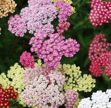 The native and very common yarrow is a fantastic plant for pollinators and is now available in a broad range of colourful cultivars. Highly recommended. Also check out its much larger yellow flowering relative from the Caucasus mountains, Achillea filipendulina.